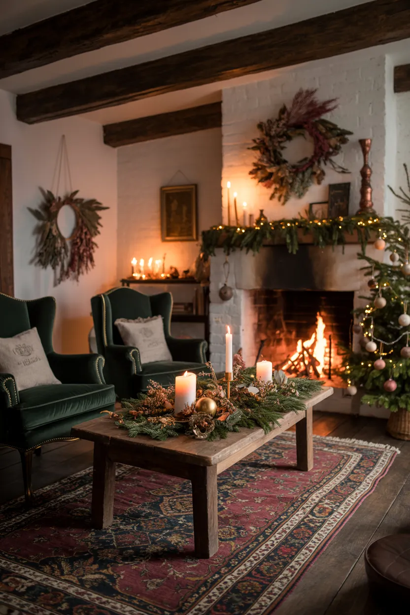Enhance the room’s cozy character with layered textures, such as plaid blankets draped over vintage sofas and muted rugs that soften dark wood floors. Incorporating unique elements like deep plum accent walls, antique Christmas village displays, and garlands wrapped around exposed wooden beams adds architectural depth and whimsical charm. Whether featuring a grand stone mantel or subtle fairy lights tucked into glass jars, the dark cottagecore approach focuses on natural greenery and golden illumination to create a timeless, cinematic holiday retreat.