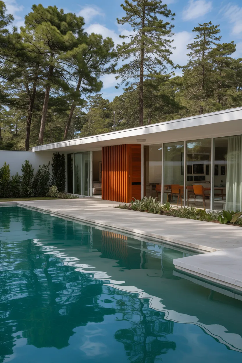 Minimalist mid-century exteriors focus on form and proportion. Clean lines and simple materials create strong visual impact.